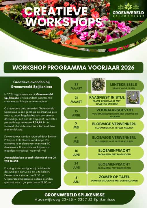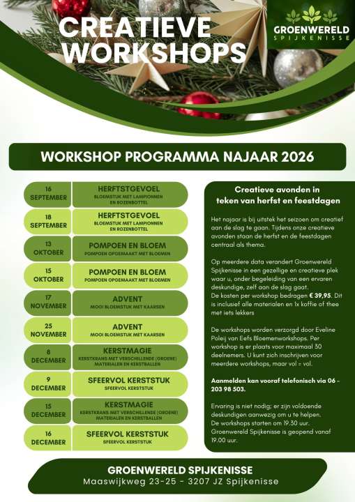 Ontdek de creatieve workshops in ons tuincentrum en laat je inspireren door de seizoenen! Het hele jaar door organiseren wij gezellige en leerzame workshops voor liefhebbers. Denk aan sfeervolle kerstkransen, kleurrijke bloemstukken en andere creatieve decoraties die perfect passen bij de feestdagen en het seizoen.